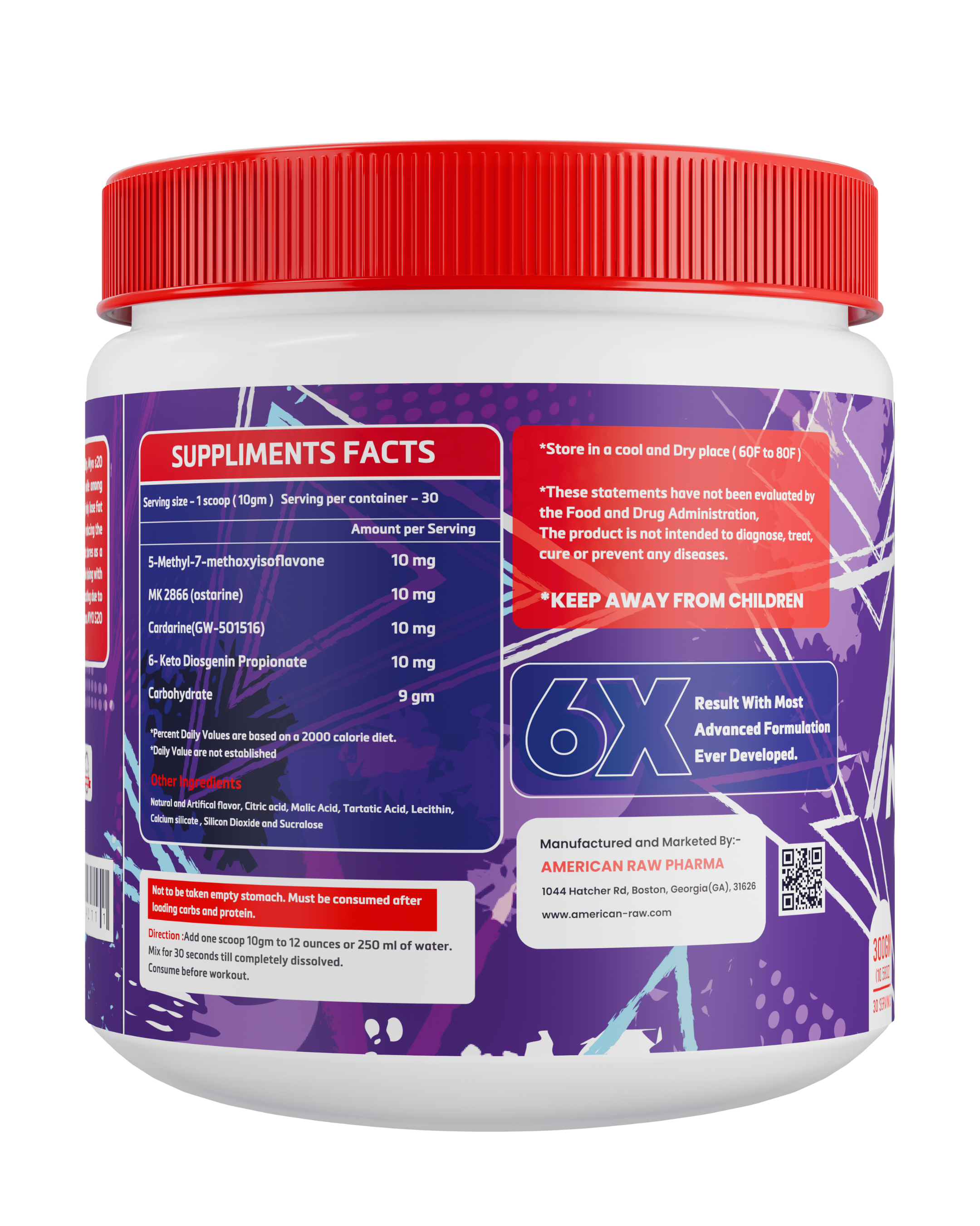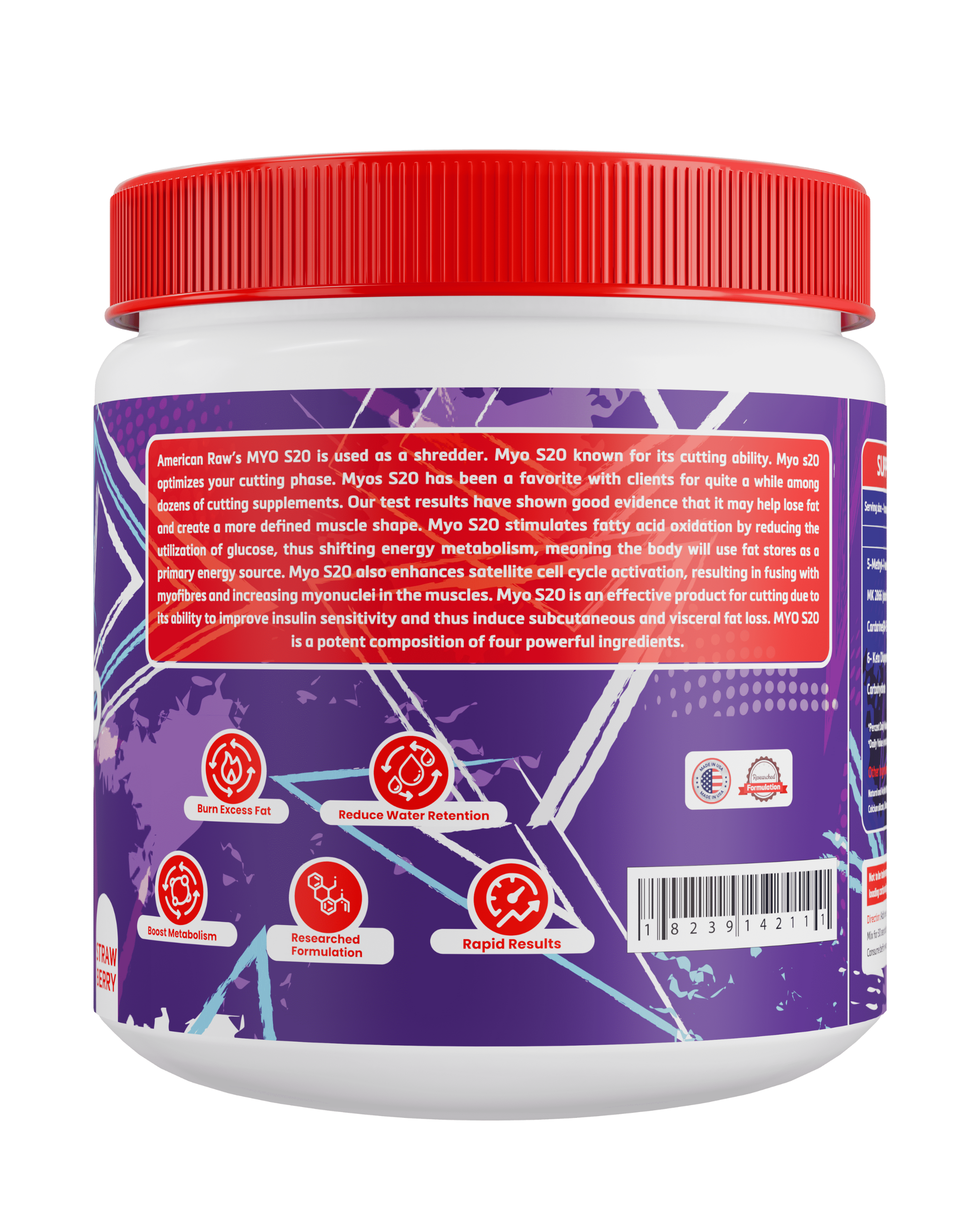 American Raw's MYO S20 is used as a shredder. MY S20 known for its cutting ability. MYO S20 optimizes your cutting phase. MYO S20 has been a favorite with clients for quite a while among dozens of cutting supplements. Our test results have shown good evidence that it may help lose fat and create a more defined muscle shape. MYO S20 stimulates fatty acid oxidation by reducing the utilization of glucose, thus shifting energy metabolism, meaning the body will use fat stores as a primary energy source.